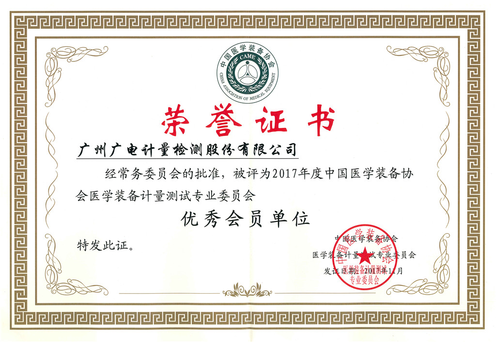 2017年度中國醫學裝備協會醫學裝備計量測試專業委員會優秀會員單位