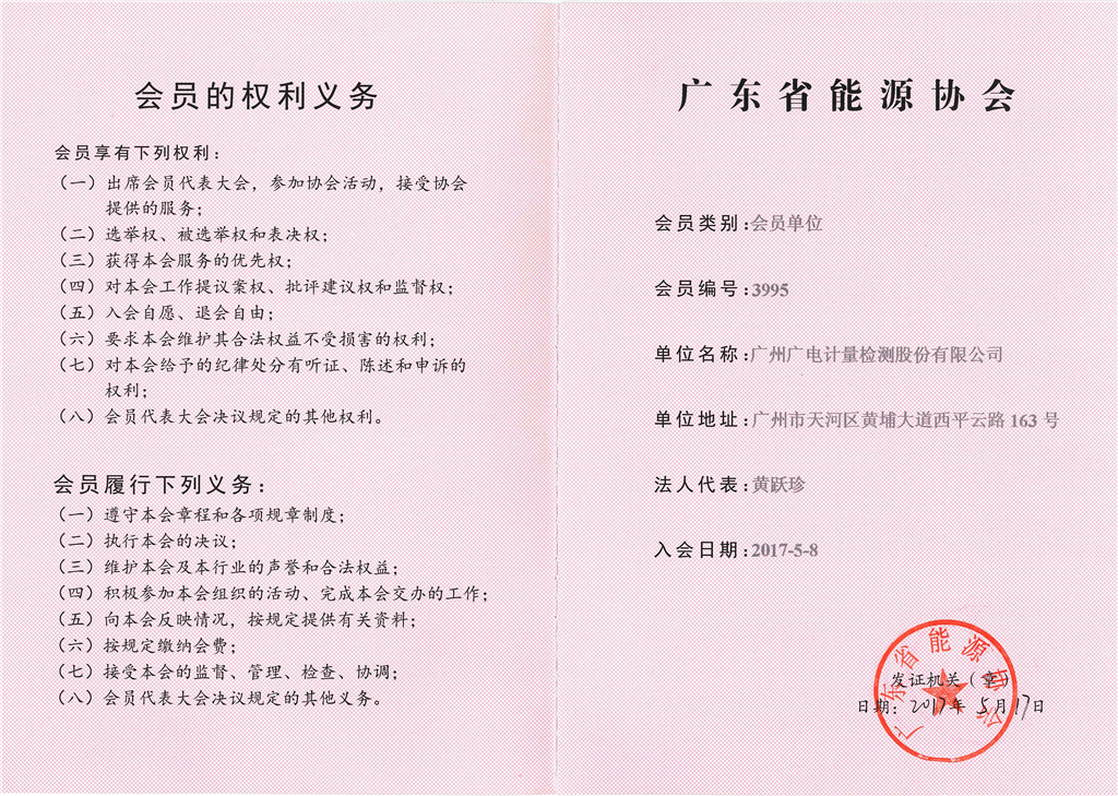 廣東省能源協會會員單位證書
