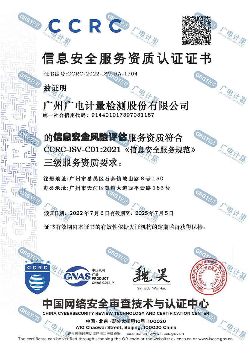 (1)廣電計(jì)量獲得中國(guó)網(wǎng)絡(luò)安全審查技術(shù)與認(rèn)證中心(CCRC)頒發(fā)的信息安全服務(wù)資質(zhì)認(rèn)證證書;