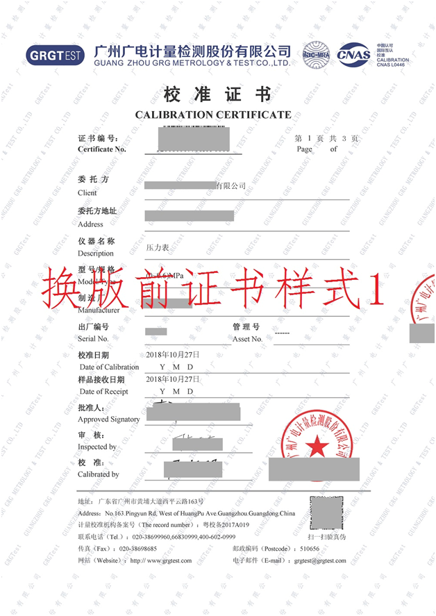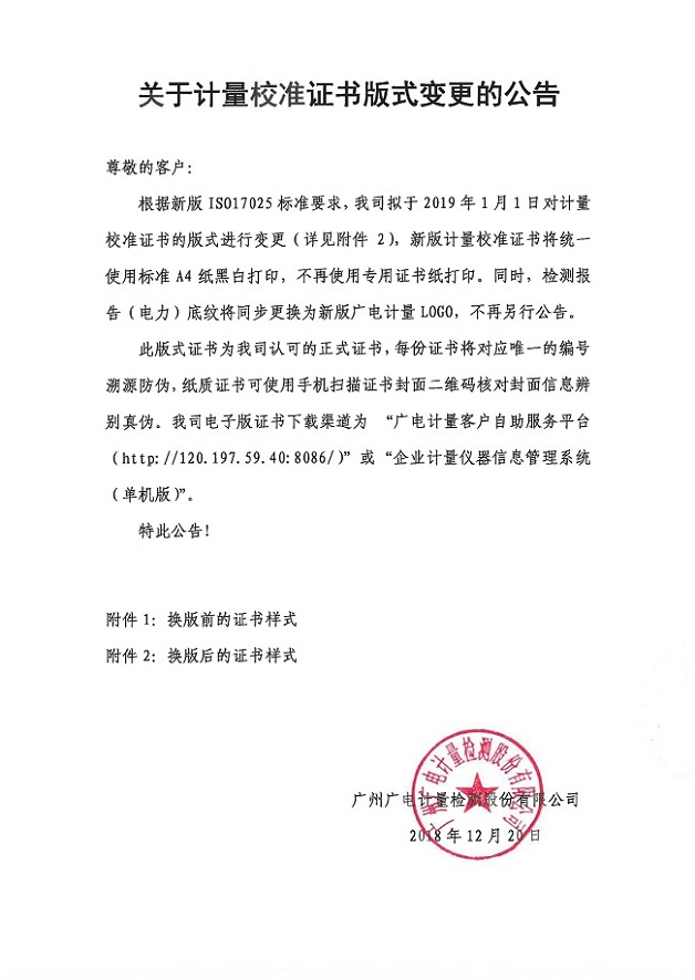 根據(jù)新版ISO17025標準要求,我司擬于2019年1月1日對計量校準證書的版式進行變更(詳見附件2),新版計量校準證書將統(tǒng)一使用標準A4紙黑白打印,不再使用專用證書紙打印。同時,檢測報告(電力)底紋將同步更換為新版廣電計量LOGO,不再另行公告。
