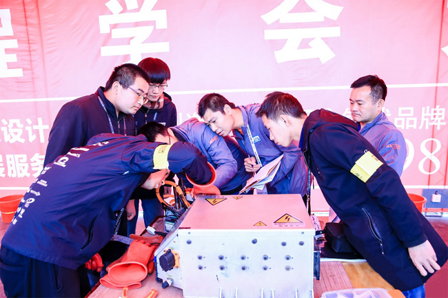 裁判團(tuán)隊(duì)對(duì)參賽車(chē)輛進(jìn)行電池箱檢測(cè)