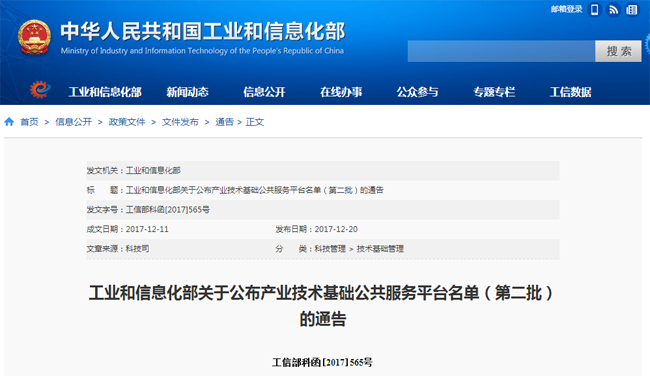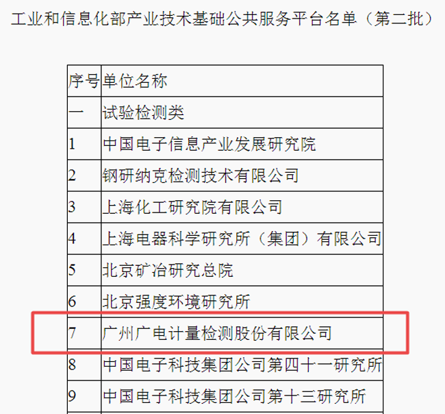 2017年12月20日,依據(jù)《工業(yè)和信息化部辦公廳關(guān)于做好2017年產(chǎn)業(yè)技術(shù)基礎(chǔ)公共服務(wù)平臺申報工作的通知》(工信廳科函〔2017〕369號),經(jīng)評審和公示,確定廣電計量等17家單位列入工業(yè)和信息化部產(chǎn)業(yè)技術(shù)基礎(chǔ)公共服務(wù)平臺名單(第二批)。