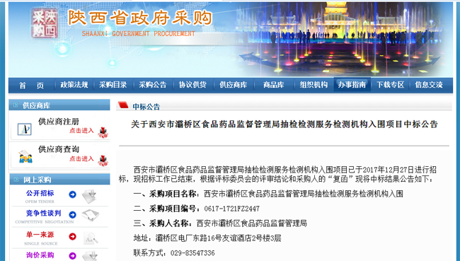 1月2日,陜西省政府采購網發布公告,廣電計量西安子公司成功中標西安市灞橋區食品藥品監督管理局抽檢檢測服務檢測機構入圍項目,服務期限2018-2019年度,斬獲廣電計量2018開年第一標!