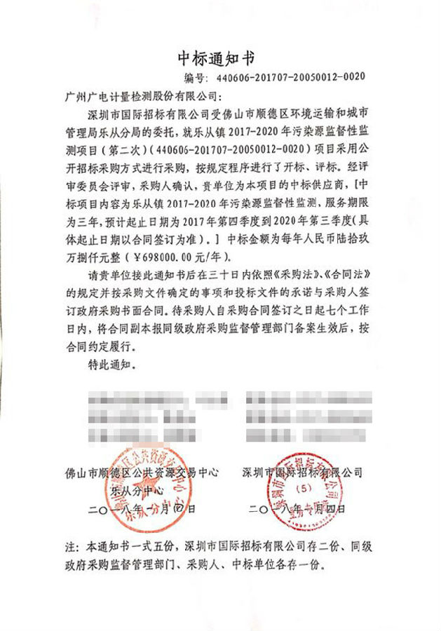 1月4日,佛山市順德區公共資源交易中心正式發布公告,廣電計量以總分第一中標佛山市順德區環境運輸和城市管理局樂從分局樂從鎮2017-2020年污染源監督性監測項目,服務期限為三年,合計中標金額209.4萬元。后續,廣電計量將為工業大市佛山探索工業文明和生態文明協調發展,建設美麗村居,守護綠水青山獻策獻力。