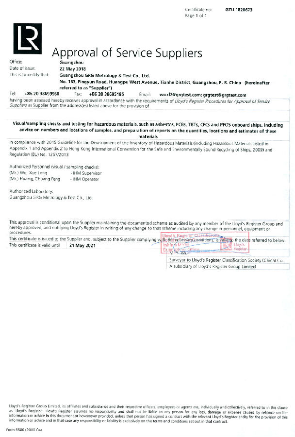5月22日,廣電計量通過一系列嚴格審核,順利獲得英國勞氏船級社授予的船舶有害物質取樣及實驗室檢測機構認可證書。這是繼獲得中國船級社(CCS)及美國船級社(ABS)船舶有害物質檢測機構認可之后,廣電計量再度獲得國際權威船級社認可。