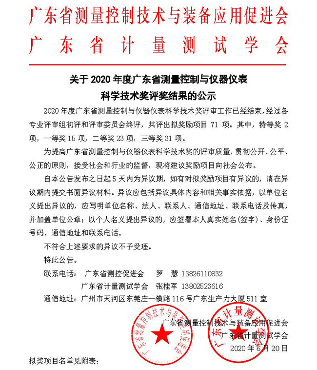 6月20日,廣東省測量控制與裝備應用促進會、廣東省計量測試學會公布了《關于2020年度廣東省測量控制與儀器儀表科學技術獎評獎結果的公示》,經過各專業評審組初評和評審委員會終評,廣電計量自主研發的四個科研項目獲獎。其中,《基于UPLC-MS/MS食品和農產品質量與安全檢測關鍵技術研究與應用》榮獲一等獎;《基于DO-160標準的感應尖峰信號發生器研制與應用》榮獲二等獎;《燈具關鍵光學參數檢測設備便攜式校準裝置及方法研究》、《發動機高原環境模擬測試系統研發與應用》榮獲三等獎。