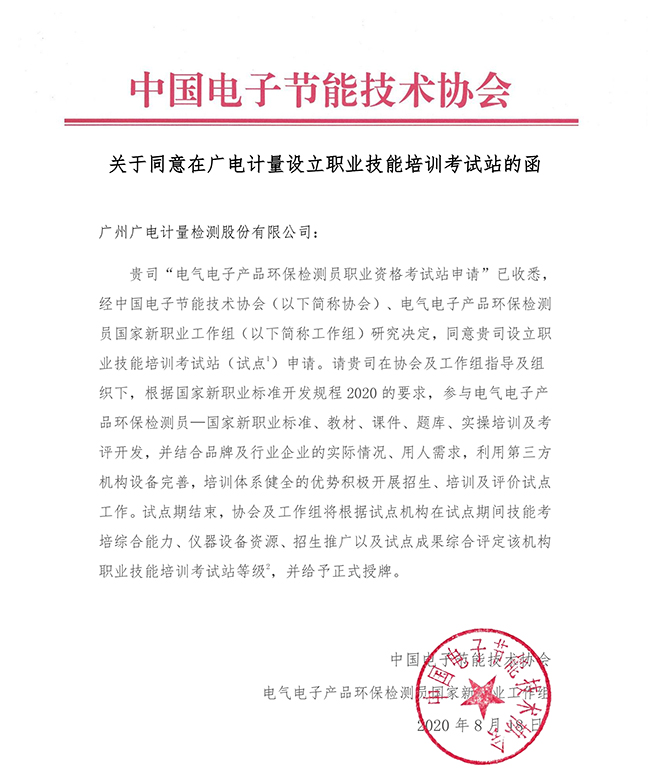 作為《標準》審定單位之一,廣電計量是中國電子節能技術協會“電氣電子產品環保檢測員 L”工作組副組長單位、“電氣電子產品環保檢測員職業技能培訓考試站”,近年來持續深耕電子電氣綠色制造與質量提升領域,參與承擔了新職業的考點、考務、教務、教材等相關任務,可為行業單位提供培訓、考核與評價服務,助力行業基礎人才建設,為產品綠色制造保駕護航。