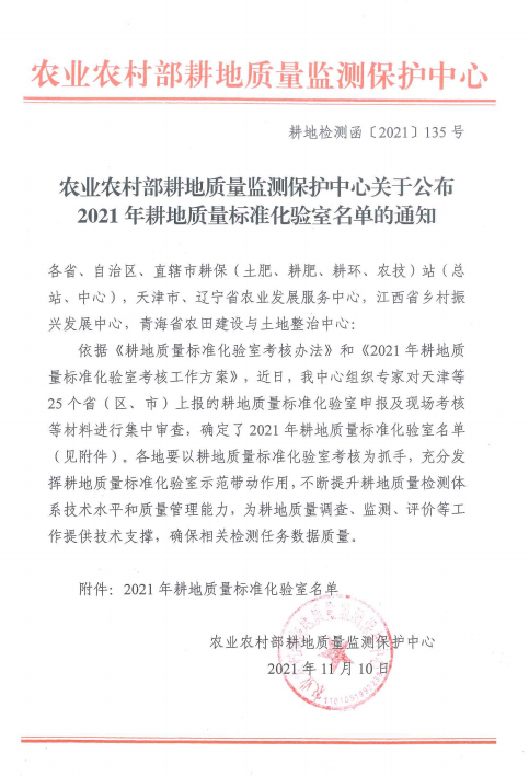 近日,農業農村部耕地質量監測保護中心發布《關于公布2021年耕地質量標準化驗室名單的通知》,河南廣電計量、西安廣電計量順利通過國家耕地質量標準化驗室考核。截至目前,廣電計量共計10個檢測基地被認定為“農業農村部耕地質量標準化驗室”。