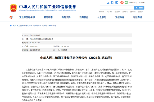 12月22日,國家工業(yè)和信息化部發(fā)布2021年第33號公告,批準了123項行業(yè)計量技術(shù)規(guī)范,將于2022年4月1日實施。由廣電計量技術(shù)專家團隊編寫的 5 項電子行業(yè)計量技術(shù)規(guī)范成功獲批發(fā)布,涵蓋衛(wèi)星通信、半導體、特種設(shè)備、汽車、電力等行業(yè)領(lǐng)域。