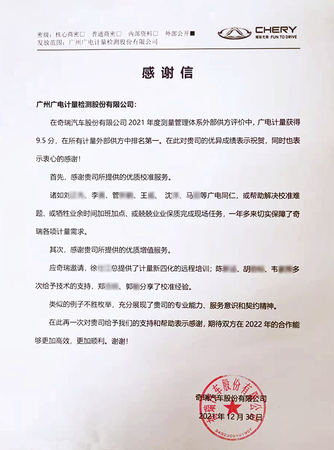 近日,廣電計(jì)量在奇瑞汽車股份有限公司(簡稱奇瑞汽車)2021年度測量管理體系外部供方評定中獲得總分第一名。奇瑞汽車發(fā)來感謝信,對廣電計(jì)量的專業(yè)技術(shù)能力、服務(wù)水平、契約精神給予高度認(rèn)可。