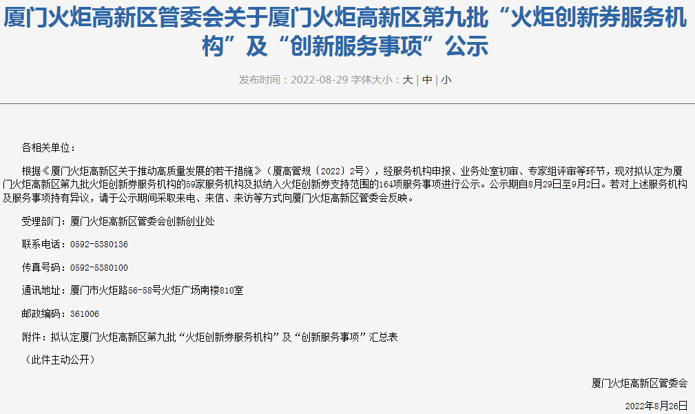 公示網(wǎng)址:http://xmtorch.xm.gov.cn/xxgk/zfxxgkml/glfw/sbxmzj/202208/t20220829_2683991.html