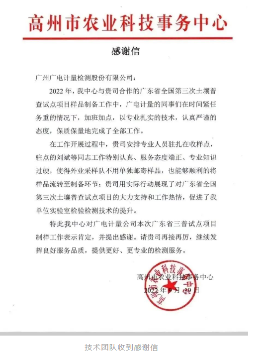廣電計量已在廣州、長沙、鄭州、南寧、沈陽、成都、南昌、西安、合肥、福州、天津等11個地區建立生態環境檢測實驗室,先后榮獲“南方耕地污染防控企業重點實驗室”“全國土壤污染狀況詳查檢測實驗室”“耕地質量標準化驗室”等項目承接資質榮譽;截至2022年7月11日,廣電計量已有10家實驗室全部入圍《第三次全國土壤普查檢測實驗室公示名單》;長沙、合肥實驗室成功?圍本省第三次全國土壤普查外業調查與采樣單位名單。