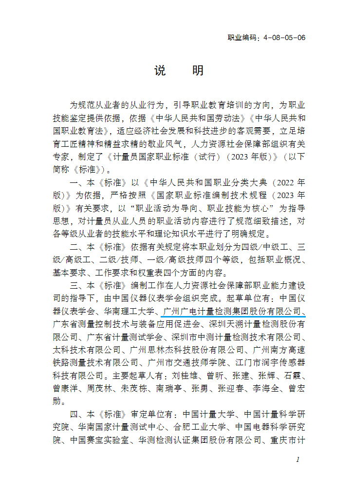 廣電計量作為《標準》主要起草單位,在人力資源社會保障部和中國儀器儀表學會的指導下,聯合華南理工大學、廣東省測量控制技術與裝備應用促進會和廣東省計量測試學會等國內知名高校和組織,充分發揮行業引領作用和資源優勢,完成了《標準》)編制,填補了計量職業技能標準空白,為計量行業高質量發展和技能人才培養作出積極貢獻。