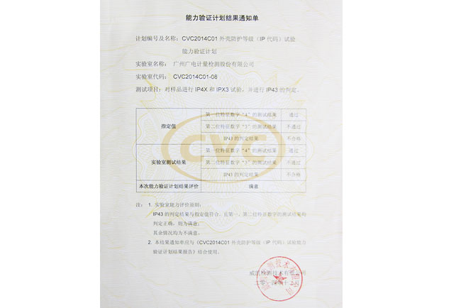 GRGT近期收到威凱檢測技術有限公司關于“CVC2014C01 外殼防護等級(IP代碼)試驗”能力驗證計劃結果通知單,結果顯示GRGT環境試驗與可靠性檢測中心以優異成績通過本次能力驗證。