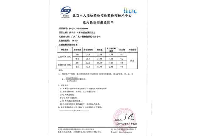 GRGT近期收到北京出入境檢驗檢疫局檢驗檢疫技術(shù)中心關(guān)于“BIQTC-PT-2015W06 紡織品 可萃取重金屬的測定”能力驗證計劃結(jié)果通知單和報告,結(jié)果顯示GRGT化學分析測試中心檢測結(jié)果的Z比分數(shù)值全部小于0.8,結(jié)果優(yōu)異,順利通過本次能力驗證。