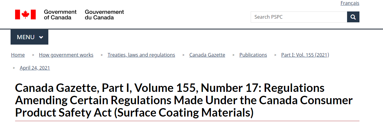 近日,加拿大衛(wèi)生部在官方公報(Canada Gazette)上發(fā)布加拿大消費品安全法案(CCPSA)管控下的表面涂層材料法規(guī)(Surface Coating Materials Regulations)更新的提議,公眾評議期70天,于2021年7月3日結(jié)束。