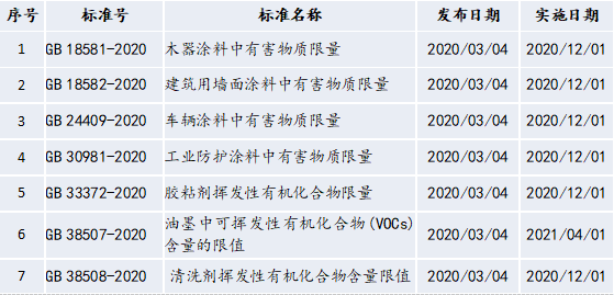 而早在2020年3月4日,國家市場監督管理總局(SAMR)、國家標準化管理委員會(SAC)在官網公告中批準發布了七項涉及涂料、膠粘劑、油墨以及清洗劑VOCs限量的強制性國家標準。截至目前,公告發布的七項強制性國家標準均已陸續正式實施。正式實施后的七項標準既作為市場監督管理部門組織監督抽查的依據,也被作為生態環境部實施企業VOCs管控的依據。