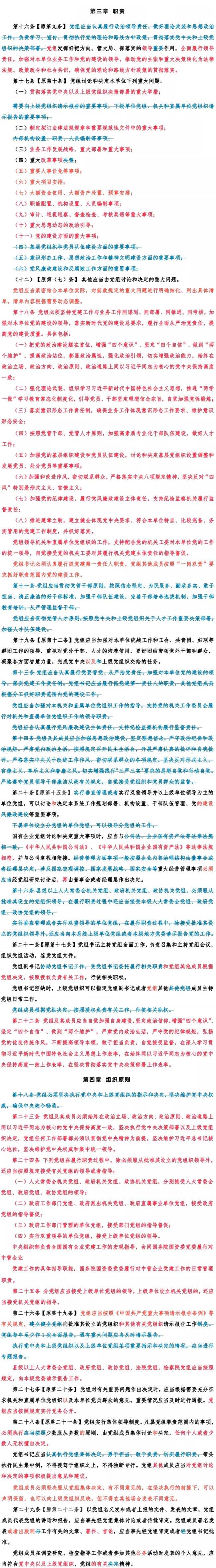 通知指出,2015年6月中共中央印發(fā)的《中國(guó)共產(chǎn)黨黨組工作條例(試行)》,對(duì)推進(jìn)黨組工作制度化、規(guī)范化、程序化發(fā)揮了重要作用。黨的十九大黨章修正案對(duì)黨組職責(zé)作了充實(shí),進(jìn)一步明確了黨組管黨治黨的政治責(zé)任。黨中央根據(jù)新的形勢(shì)、任務(wù)和要求,對(duì)條例予以修訂完善。