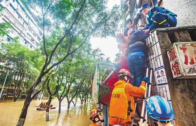 6月22日,綦江區菜壩社區部分居民樓被淹,救援人員緊急轉移被困群眾。記者 龍帆 攝/視覺重慶