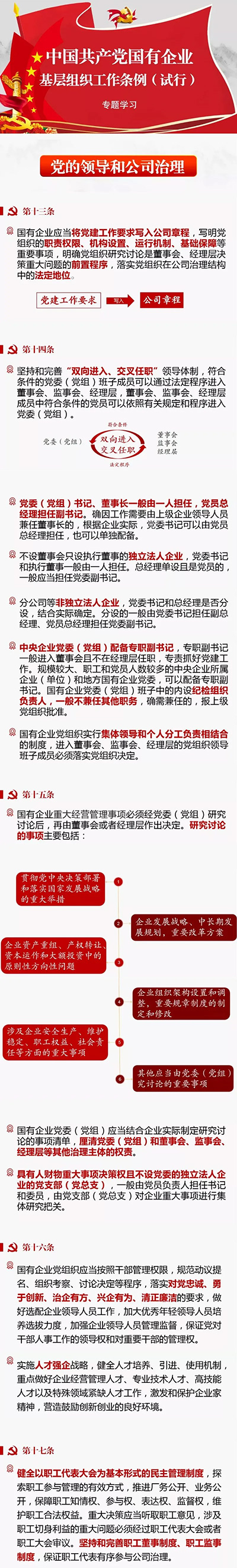 《中國共產(chǎn)黨國有企業(yè)基層組織工作條例(試行)》對國有企業(yè)黨組織工作作出了全面規(guī)范,是新時代加強國有企業(yè)黨的建設的基本遵循。