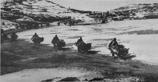 三大戰(zhàn)役期間,解放區(qū)農(nóng)民在冰天雪地中用小車(chē)把彈藥、物資運(yùn)往前線(xiàn)。圖片來(lái)源:《中國(guó)共產(chǎn)黨的九十年》